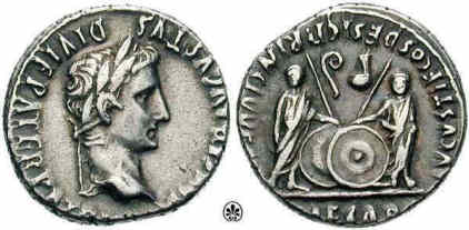 letzten in Lugdunum geprägten Denartypen des Augustus (gleicher Avers wie